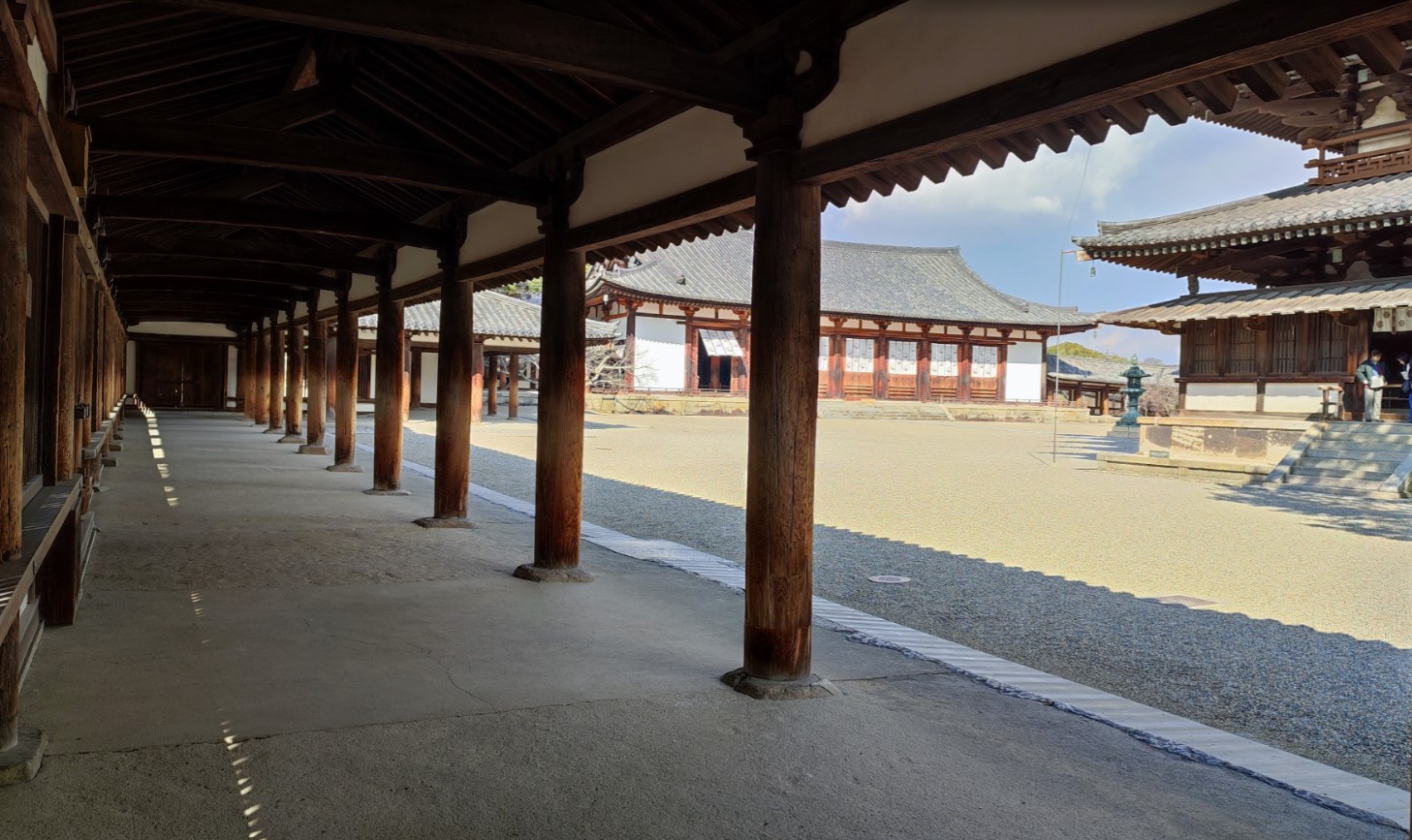 法隆寺整體格局採「西院伽藍」配置,五重木塔與金堂並列於中庭兩側,形成罕見的左右並置布局。
