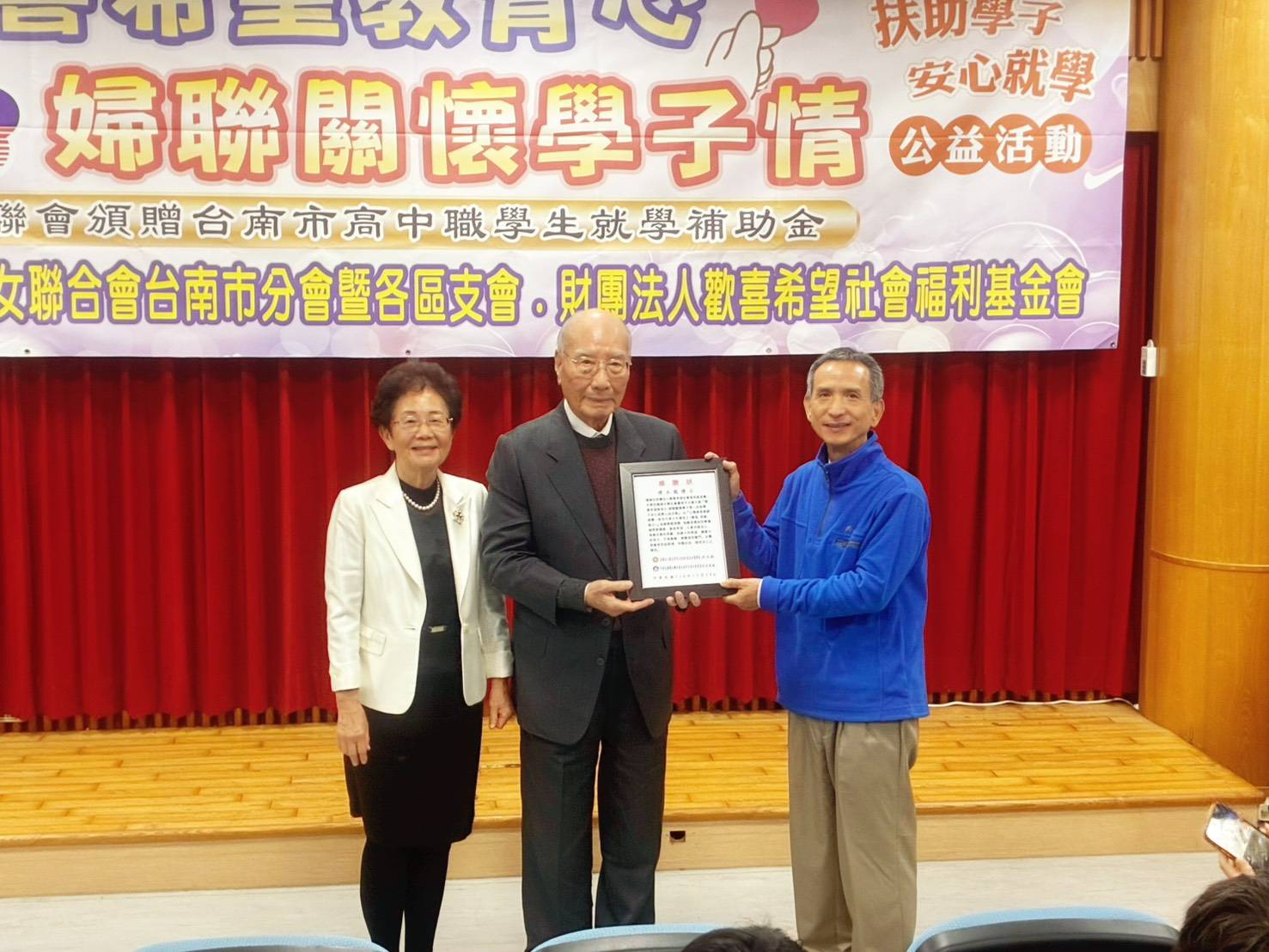 中華民國婦女聯合會與財團法人中華民國婦聯社會福利基金會為協助清寒弱勢家庭的孩子安心努力向學,14日上午假新營高中,頒贈臺南市轄內25校之39位高中職學生就學補助金,每人一萬元。頒贈儀式係由婦聯會臺南市分會與歡喜希望社會福利基金會攜手辦理。歡喜希望社會福利基金會則捐款五萬元給新營高中「教育儲蓄專戶」,共同為扶助弱勢學生,確保安心就學略盡綿薄。