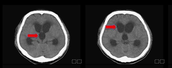 圖一、手術前腦部斷層掃描,發現所有的腦室脹大(紅色箭頭,黑色部份構造)。