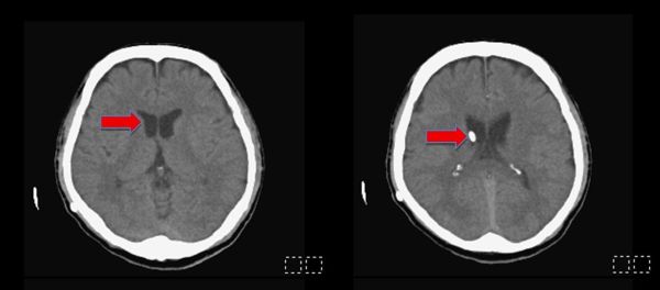 圖二、手術後半年,腦部電腦斷層影像顯示,所有脹大的腦室皆已恢復正常大小,可見到所放置右側腦室的導管(紅色箭頭)。