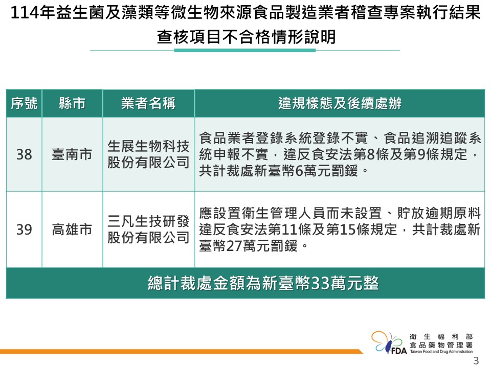 這波稽查共查核 46 家業者、104 件產品,並抽驗 61 件成品與原料。違規最嚴重的是高雄「三凡生技研發」,除了沒設置衛生管理人員外,倉庫還放著已逾期的丹蔘發酵液與酵母鉻等原料,最久過期超過半年。業者辯稱「要銷毀但忘了清」,仍遭重罰 27 萬元。