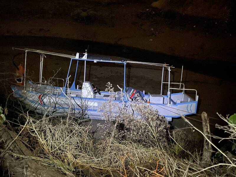 苗栗龍鳳漁港被竊漁船遭棄置在新竹新月漁港旁的草叢內。翻攝畫面