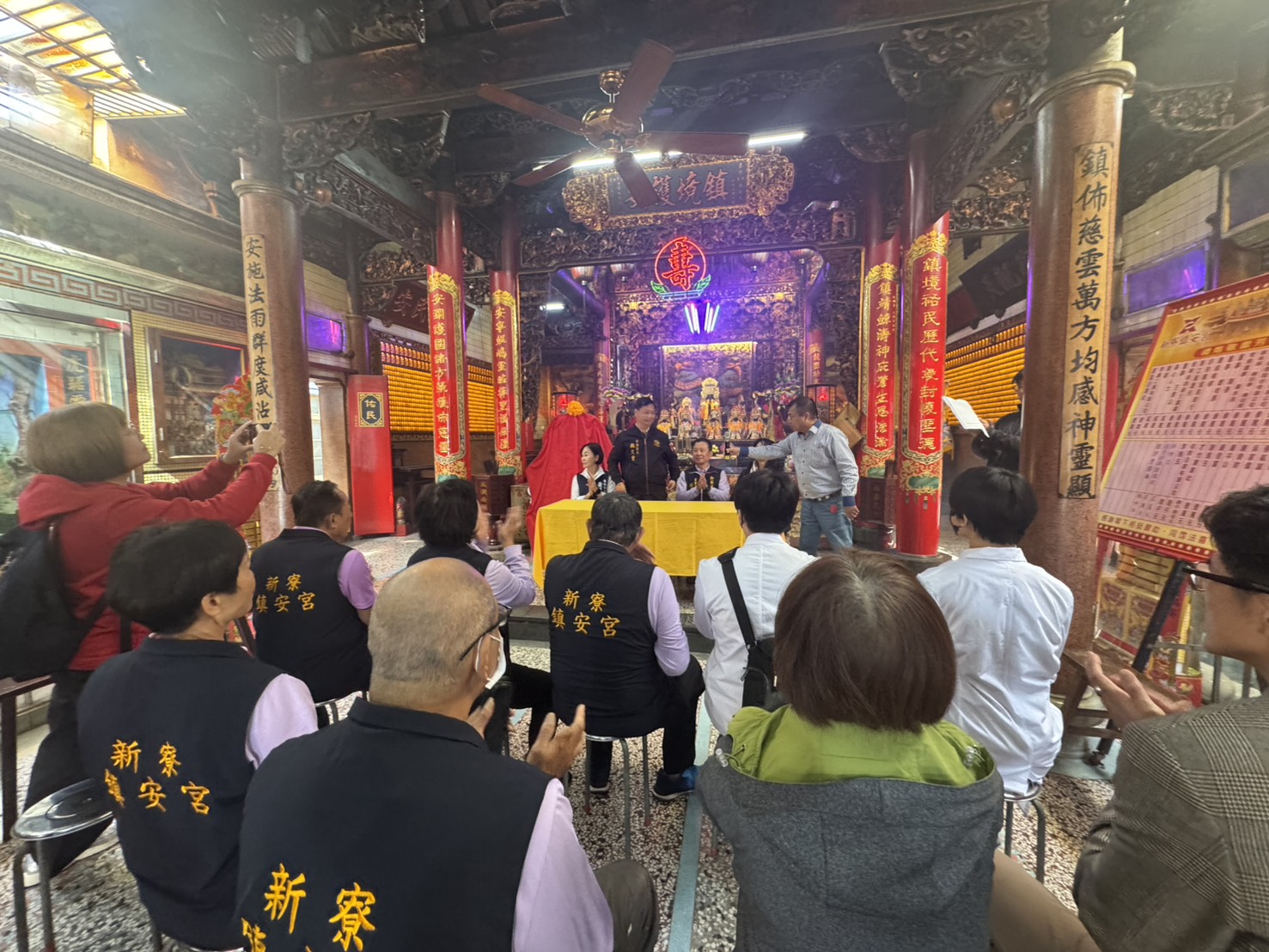 新寮鎮安宮於今(14)日揭開會香遶境大典序幕,儀式從上午10點正式宣告醮典開始,由陳祭司忠煌進行科儀奏疏文祭拜,並邀請臺南市政府葉澤山副市長、黃麗招議員、臺南市文化資產管理處處長陳思瑀、安南區長魏文貴、意境東方藝術團隊修復師紀貴堡等長官貴賓一同見證,董事長鄭炎煌率領全體董事等共同參與,一起為乙巳年會香遶境大典揭開序幕。