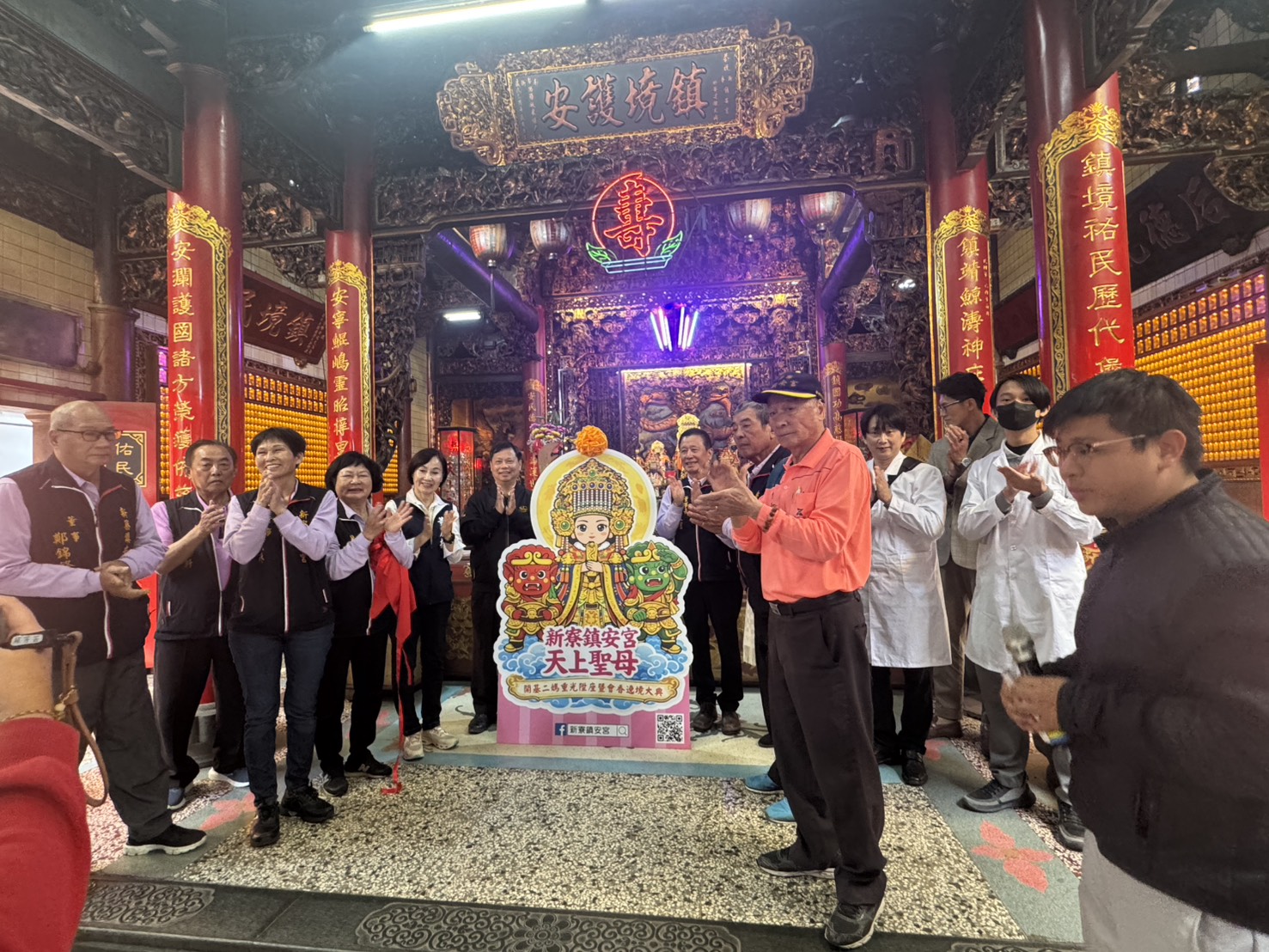新寮鎮安宮董事會董事長鄭炎煌表示,去(114)年8月新寮鎮安宮依循聖母指示,在廟方代表、三壇法師、民意代表以及各界專家學者與修復團隊見證下,進行了過去百年從未辦過的「開基二媽開臟儀式」。參與的各方代表在神像臟室內驚見一個長約 5 公分、以紅布包裹的神像頭部,經聖母降示為清代「新藔」庄原始開基媽祖金身,因昔日劫厄,先輩們依神諭將聖母頭部善藏於重塑之金身內,使靈光永續。本次「開基二媽重光陞座暨會香遶境大典」將於本周末1月17至1月18日展開,鎮安宮特別設計約160公分高之立牌供民眾拍照打卡留念。這兩天的活動亦搭配辦理藝文市集和新寮台江文化藝術節,除了美食攤位外,廟方亦贊助20攤給勞工局弱勢團體公益義賣攤並提供手工折氣球免費索取。活動內容除有淨零闖關、掌中戲劇團民俗、創藝造型棉花糖等免費體驗外,另外更有7米長的仿真霸王龍展示,歡迎各地遊客前來見證聖典、共襄盛舉。