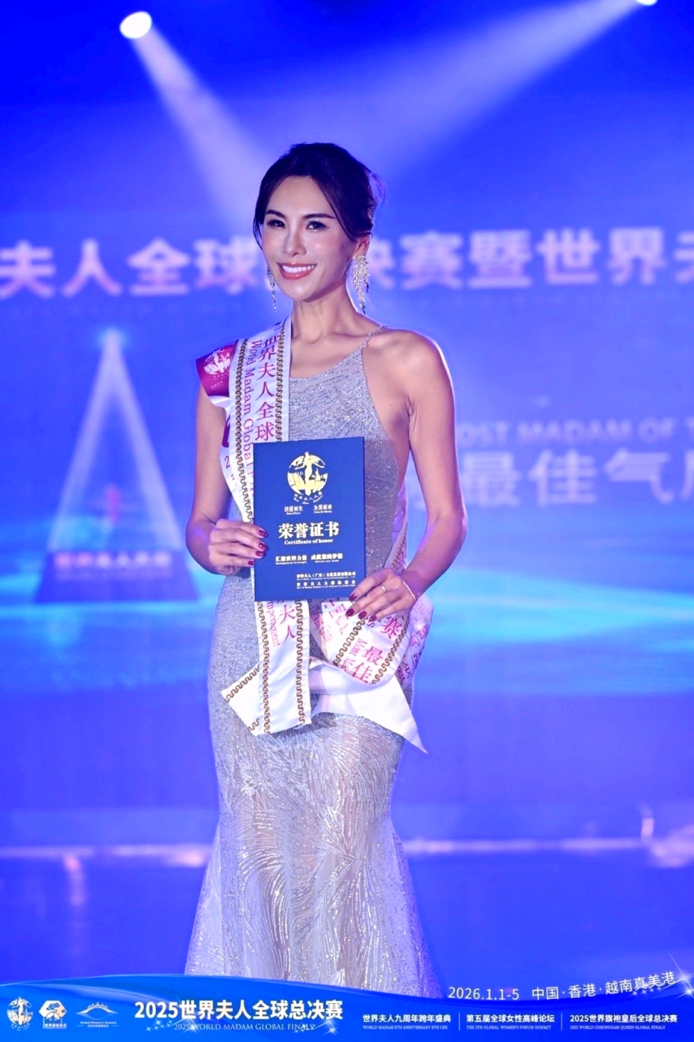 ▲2025世界夫人全球總決賽唯一雙料獎項得主台灣夫人巫鳳儀-全球最佳氣質夫人獎。(圖/范玉玲雅商學院-英國皇室形體儀態體系提供)