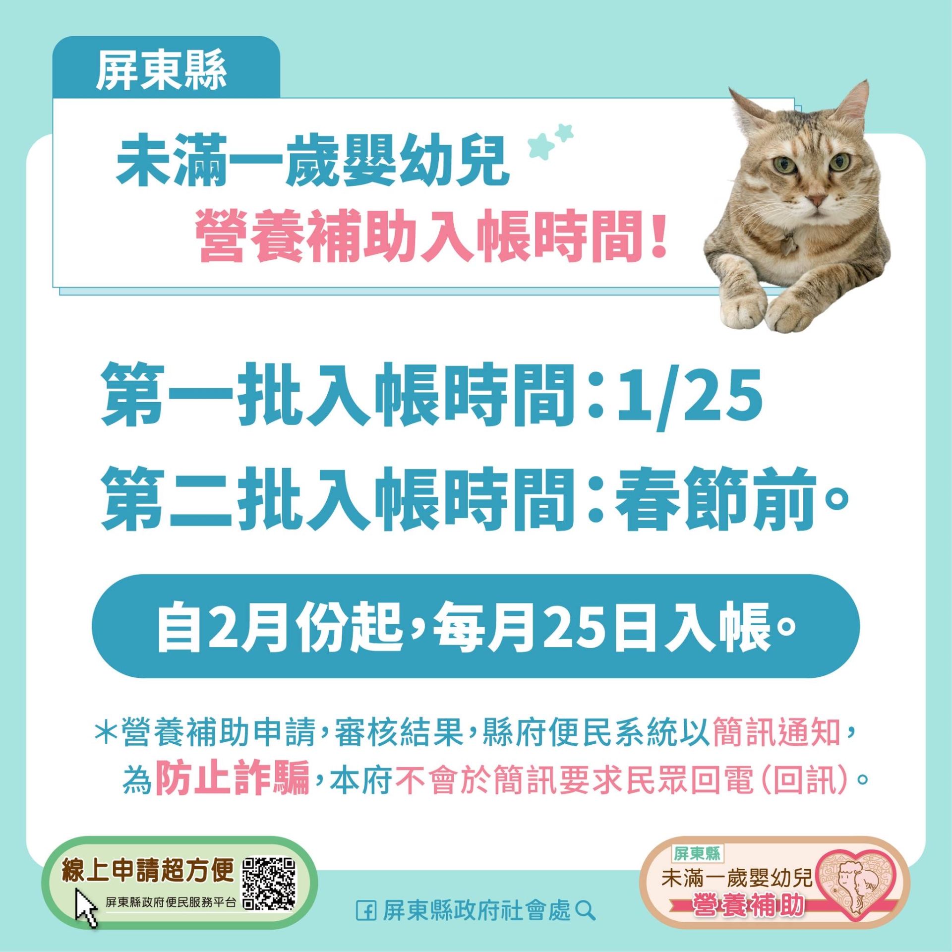 為減輕家庭育兒經濟負擔,屏東縣政府自115年1月1日起正式開辦「未滿一歲嬰幼兒營養補助」,並採全面線上申請的便民措施。社會處表示,系統於去(114)年12月31日跨年後即陸續接獲民眾申請,截至目前已累計超過2,000件申請案,顯示線上申請流程便利,民眾反應相當踴躍。