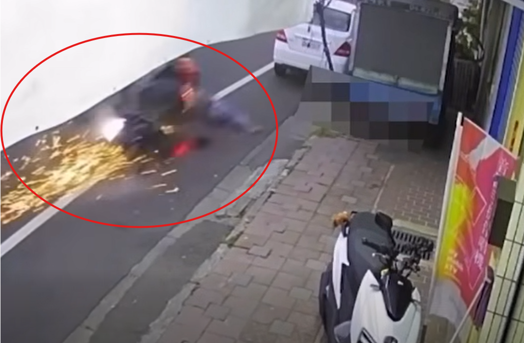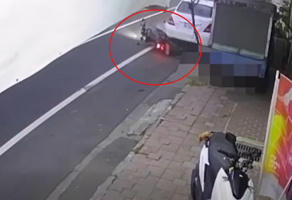 【Lai傳媒、記者爆料網/林千允/彰化報導】彰化永靖鄉昨天傍晚發生一起讓人看了心驚膽顫的機車車禍,49歲石姓女騎士與22歲胡姓男騎士在中山路口發生碰撞,瞬間火花四射,石女連人帶車像被彈飛一樣往前猛衝,最後整個人和機車一起卡進路邊停放的白色轎車車底,驚險過程全被監視器拍下。