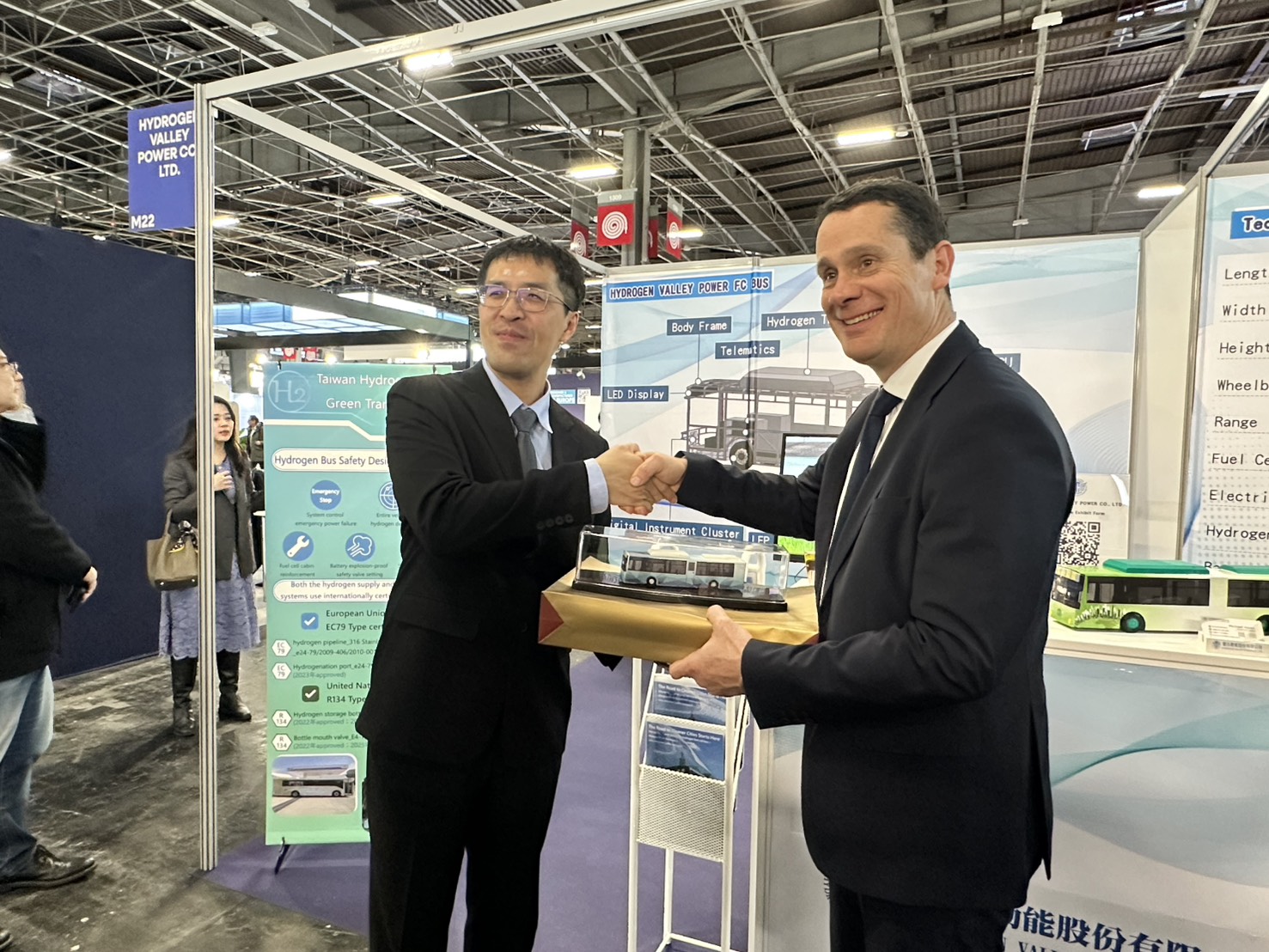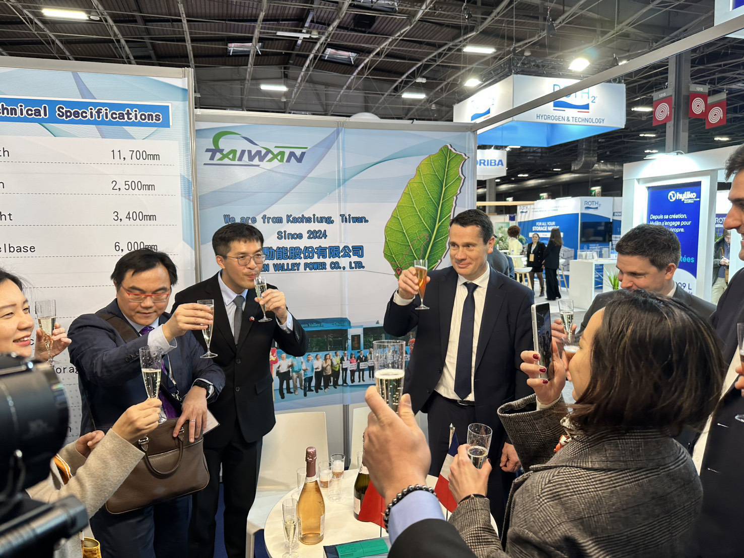 展會期間,氫谷動能之整車解決方案吸引多家歐洲氫能設備商、公共運輸營運單位及政策研究機構關注 。在駐法國台北代表處與巴黎台灣貿易中心的協助下,雙方深入討論了氫能公共運輸導入模式、供氫基礎設施整合及歐盟市場準入機制等關鍵面向 。