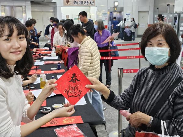 高雄大學學務長王明月表示,與高雄捷運公司攜手舉辦「揮毫贈春聯」活動至今已邁入第 12 年,從捷運場站延伸至社區與在地信仰中心,不僅傳承書法藝術文化,也讓學生在服務中學習,實踐大學社會責任,體現高雄大學與在地共好、共享節慶溫度的精神。她指出,農曆春節張貼春聯是華人社會重要習俗,透過師生親手書寫、現場結緣的方式,讓民眾在馬年新春之際,感受到手寫書法所承載的祝福與溫度。
