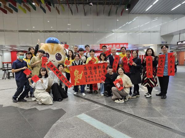 高雄大學學務處統籌規劃「揮毫贈春聯」傳統,帶領「書法研究社」師生,攜手高雄捷運公司、在地信仰中心,把年節祝福送進捷運場站、廟埕與社區,展現大學與城市、地方共榮共好的實踐行動。