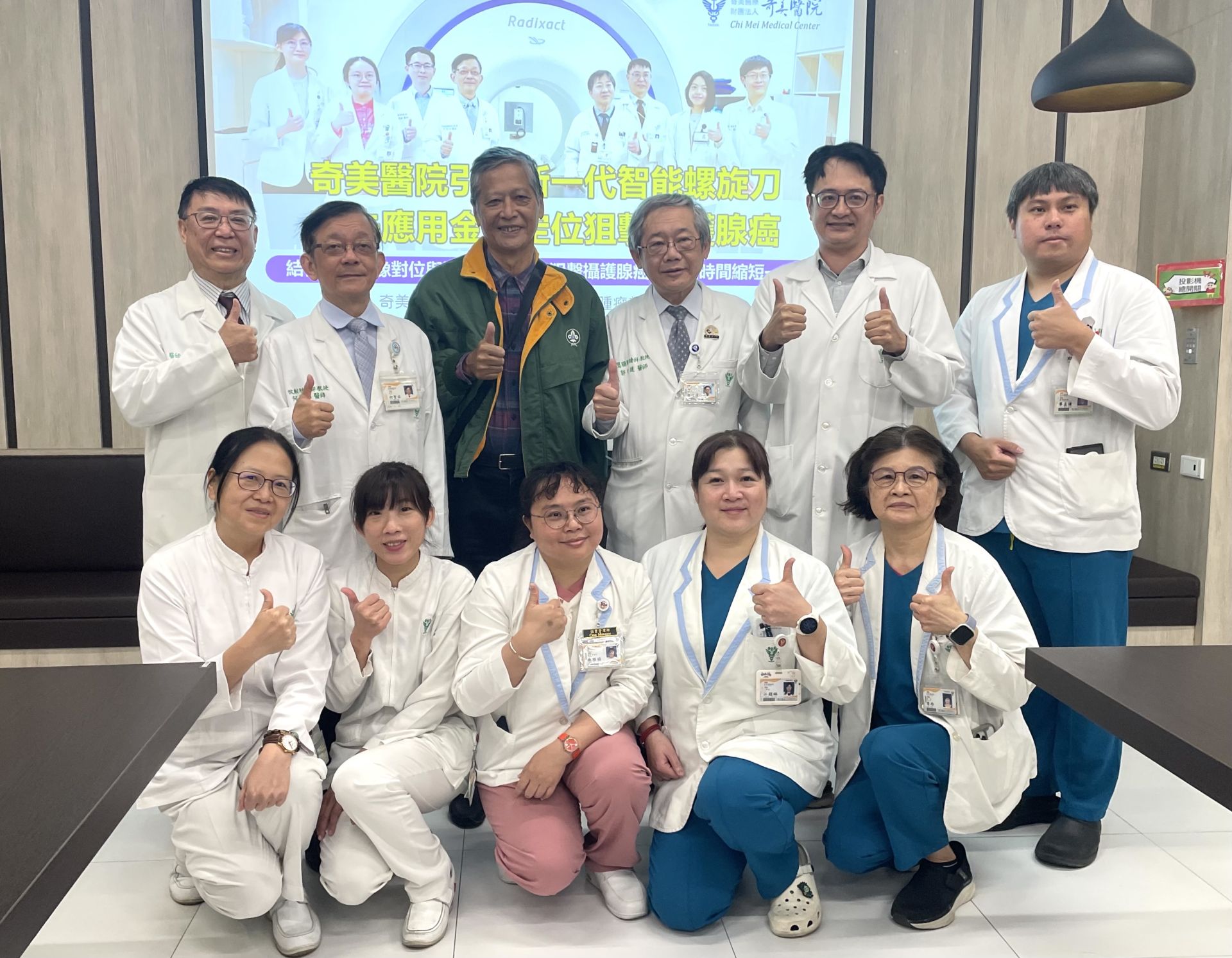 70歲林姓男子於外院確診攝護腺癌,轉診到奇美醫院泌尿腫瘤科及跨專科醫療團隊評估後,決定採新一代放射治療系統「智能螺旋刀」搭配即時追蹤技術,先在開刀房由泌尿外科放入4根金針至攝護腺內作為治療定位基準,克服傳統放療容易因攝護腺位置變化而產生的治療偏差,確保腫瘤每次都能精準接受高劑量照射,同時將單次療程從1小時大幅縮短至30分鐘內。林先生在出席記者會,開心感謝醫師讓自己在長期的治療過程中,依然能維持良好的生活品質。
