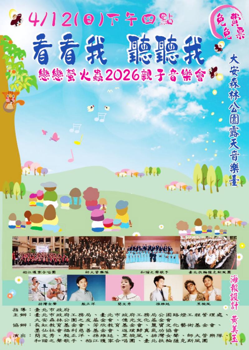 看螢火蟲一定要翻山越嶺嗎?今年4月臺北市政府的螢火蟲季即將開跑,在各界努力下,成功讓點點螢光重現都市綠洲。臺北市政府工務局暨公園路燈工程管理處、大安森林公園之友基金會及億光文化基金會將於4/12(週日)下午4點在大安森林公園舉辦「看看我.聽聽我」親子音樂會,為大家帶來舒心的春暖午後!