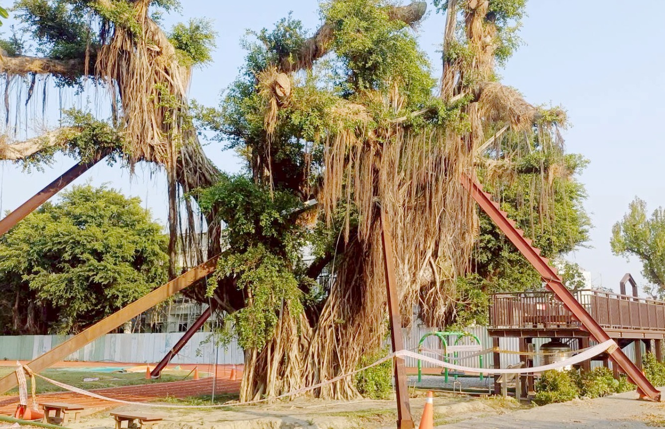 ▲丹娜絲颱風造成安業國小內編號168列管百年老榕倒伏,今已重獲新生。(農業局 提供)